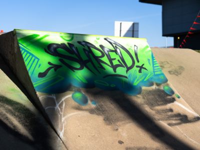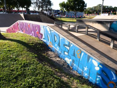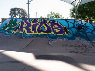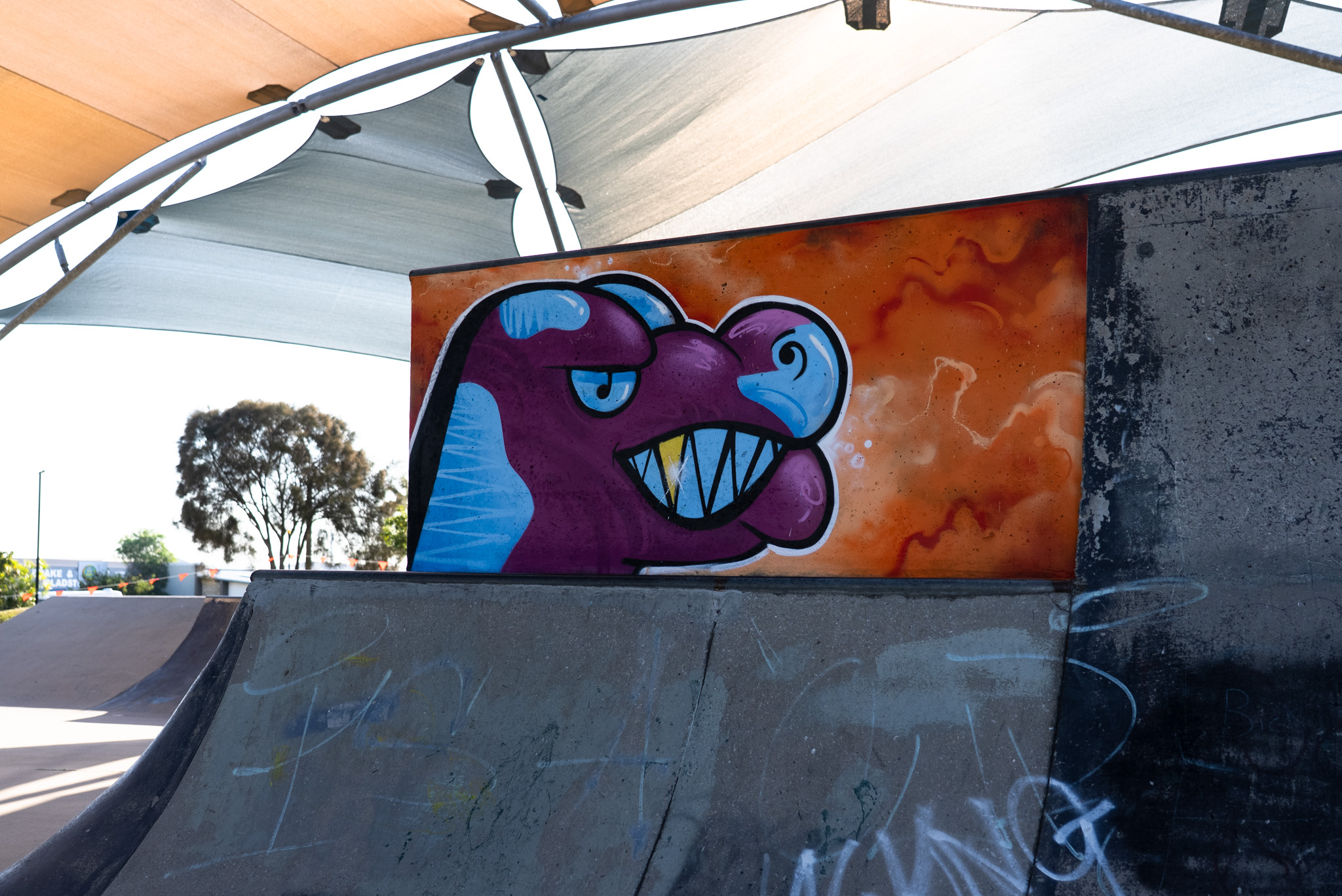 From 24-26 September 2025, Council held a graffiti art project workshop for 13–17-year-olds, to learn new skills, create their own mini artworks, and help inspire the final skate park mural. At the end of the workshop selected participants were invited to assist Morris in bringing the designs to life.